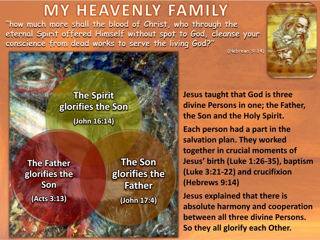 MY HEAVENLY FAMILY “how much more shall the blood of Christ, who through the eternal Spirit offered Himself without spot to God, cleanse your conscience from dead works to serve the living God?” (Hebrews 9:14) Jesus taught that God is three divine Persons in one; the Father, the Son and the Holy Spirit. Each person had a part in the salvation plan. They worked together in crucial moments of Jesus’ birth (Luke 1:26-35), baptism (Luke 3:21-22) and crucifixion (Hebrews 9:14) Jesus explained that there is absolute harmony and cooperation between all three divine Persons. So they all glorify each Other.