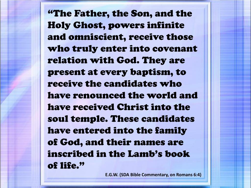 “The Father, the Son, and the Holy Ghost, powers infinite and omniscient, receive those who truly enter into covenant relation with God. They are present at every baptism, to receive the candidates who have renounced the world and have received Christ into the soul temple. These candidates have entered into the family of God, and their names are inscribed in the Lamb’s book of life.” E.G.W. (SDA Bible Commentary, on Romans 6:4)