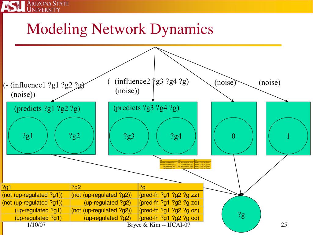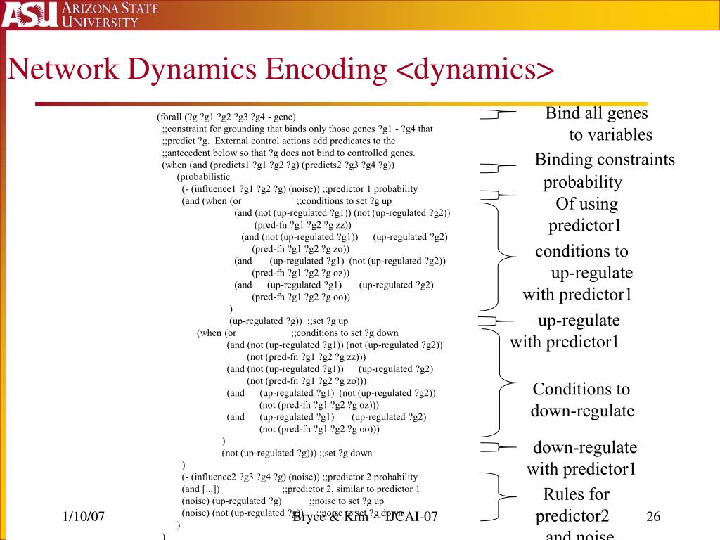 Network Dynamics Encoding <dynamics> Bind all genes to variables (forall (?g ?g1 ?g2 ?g3 ?g4 - gene) ;;constraint for grounding that binds only those genes ?g1 - ?g4 that ;;predict ?g. External control actions add predicates to the ;;antecedent below so that ?g does not bind to controlled genes. (when (and (predicts1 ?g1 ?g2 ?g) (predicts2 ?g3 ?g4 ?g)) (probabilistic (- (influence1 ?g1 ?g2 ?g) (noise)) ;;predictor 1 probability (and (when (or ;;conditions to set ?g up (and (not (up-regulated ?g1)) (not (up-regulated ?g2)) (pred-fn ?g1 ?g2 ?g zz)) (and (not (up-regulated ?g1)) (up-regulated ?g2) (pred-fn ?g1 ?g2 ?g zo)) (and (up-regulated ?g1) (not (up-regulated ?g2)) (pred-fn ?g1 ?g2 ?g oz)) (and (up-regulated ?g1) (up-regulated ?g2) (pred-fn ?g1 ?g2 ?g oo)) ) (up-regulated ?g)) ;;set ?g up (when (or ;;conditions to set ?g down (and (not (up-regulated ?g1)) (not (up-regulated ?g2)) (not (pred-fn ?g1 ?g2 ?g zz))) (and (not (up-regulated ?g1)) (up-regulated ?g2) (not (pred-fn ?g1 ?g2 ?g zo))) (and (up-regulated ?g1) (not (up-regulated ?g2)) (not (pred-fn ?g1 ?g2 ?g oz))) (and (up-regulated ?g1) (up-regulated ?g2) (not (pred-fn ?g1 ?g2 ?g oo))) ) (not (up-regulated ?g))) ;;set ?g down ) (- (influence2 ?g3 ?g4 ?g) (noise)) ;;predictor 2 probability (and [...]) ;;predictor 2, similar to predictor 1 (noise) (up-regulated ?g) ;;noise to set ?g up (noise) (not (up-regulated ?g)) ;;noise to set ?g down ) ) ) Binding constraints probability Of using predictor1 conditions to up-regulate with predictor1 up-regulate with predictor1 Conditions to down-regulate down-regulate with predictor1 Rules for predictor2 and noise Bryce & Kim -- IJCAI-07