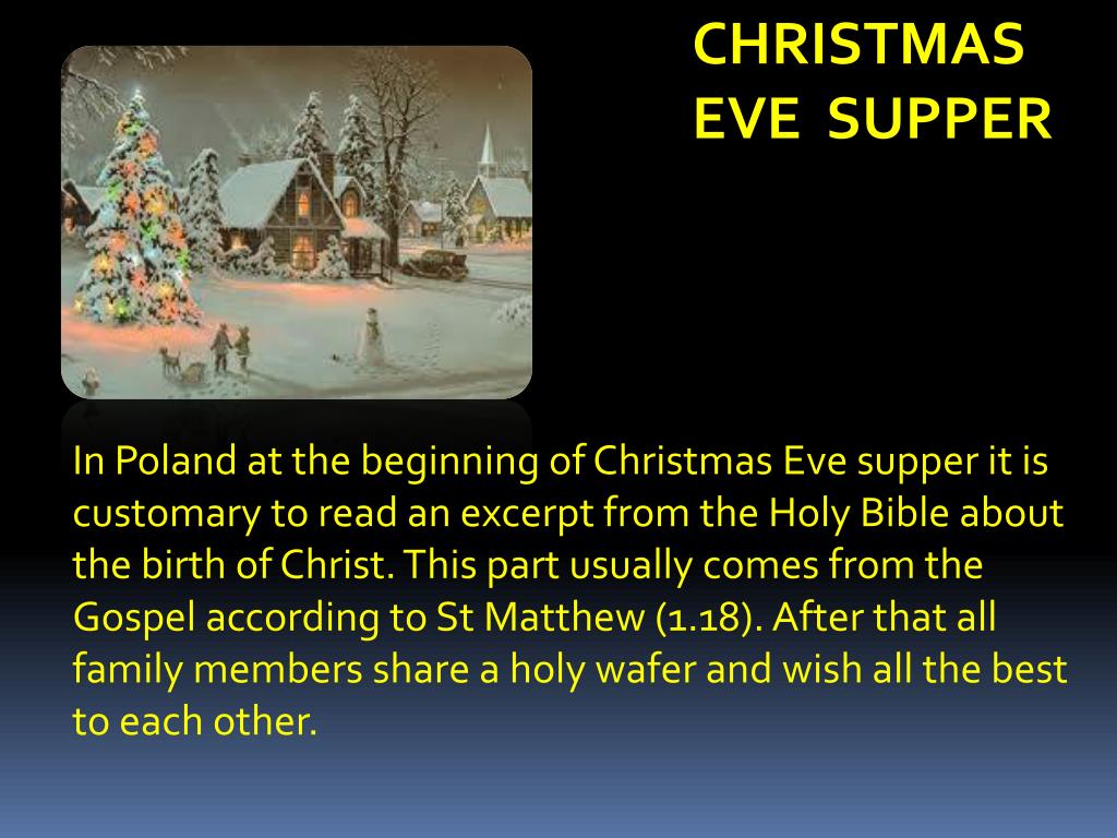 7. CHRISTMAS EVE SUPPER In Poland at the beginning of Christmas Eve supper it is customary to read an excerpt from the Holy Bible about the birth of Christ. This part usually comes from the Gospel according to St Matthew (1.18). After that all family members share a holy wafer and wish all the best to each other.