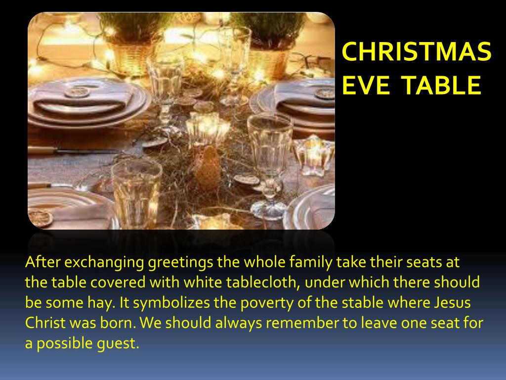 8. CHRISTMAS EVE TABLE After exchanging greetings the whole family take their seats at the table covered with white tablecloth, under which there should be some hay. It symbolizes the poverty of the stable where Jesus Christ was born. We should always remember to leave one seat for a possible guest.
