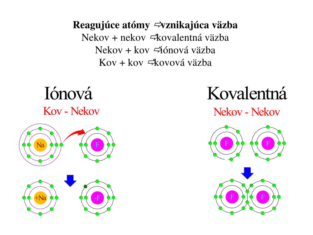 Reagujúce atómy đ vznikajúca väzba Nekov + nekov đ kovalentná väzba Nekov + kov đ iónová väzba Kov + kov đ kovová väzba