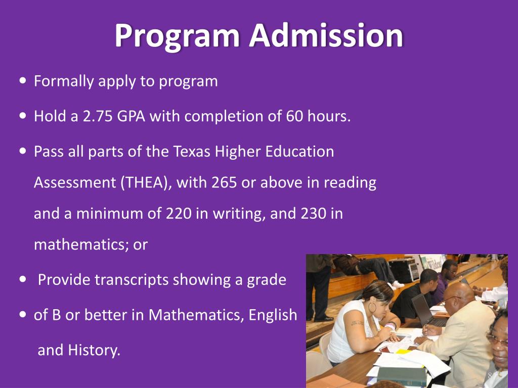 Program Admission • Formally apply to program • Hold a 2.75 GPA with completion of 60 hours. • Pass all parts of the Texas Higher Education Assessment (THEA), with 265 or above in reading and a minimum of 220 in writing, and 230 in mathematics; or • Provide transcripts showing a grade • of B or better in Mathematics, English and History.
