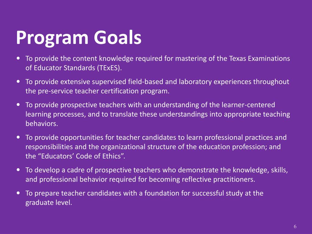 Program Goals • To provide the content knowledge required for mastering of the Texas Examinations of Educator Standards (TExES). • To provide extensive supervised field-based and laboratory experiences throughout the pre-service teacher certification program. • To provide prospective teachers with an understanding of the learner-centered learning processes, and to translate these understandings into appropriate teaching behaviors. • To provide opportunities for teacher candidates to learn professional practices and responsibilities and the organizational structure of the education profession; and the “Educators’ Code of Ethics”. • To develop a cadre of prospective teachers who demonstrate the knowledge, skills, and professional behavior required for becoming reflective practitioners. • To prepare teacher candidates with a foundation for successful study at the graduate level.