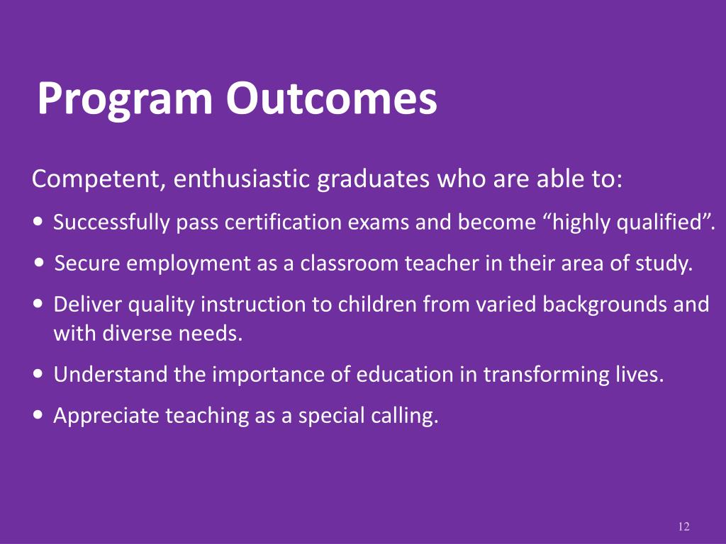 Program Outcomes Competent, enthusiastic graduates who are able to: • Successfully pass certification exams and become “highly qualified”. • Secure employment as a classroom teacher in their area of study. • Deliver quality instruction to children from varied backgrounds and with diverse needs. • Understand the importance of education in transforming lives. • Appreciate teaching as a special calling.