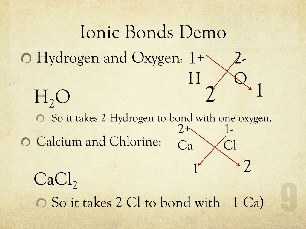 Ionic Bonds Demo 1+ 2- H O • Hydrogen and Oxygen: • So it takes 2 Hydrogen to bond with one oxygen. • Calcium and Chlorine: • So it takes 2 Cl to bond with 1 Ca) 1 2 H2O 2+ 1- Ca Cl 2 1 CaCl2
