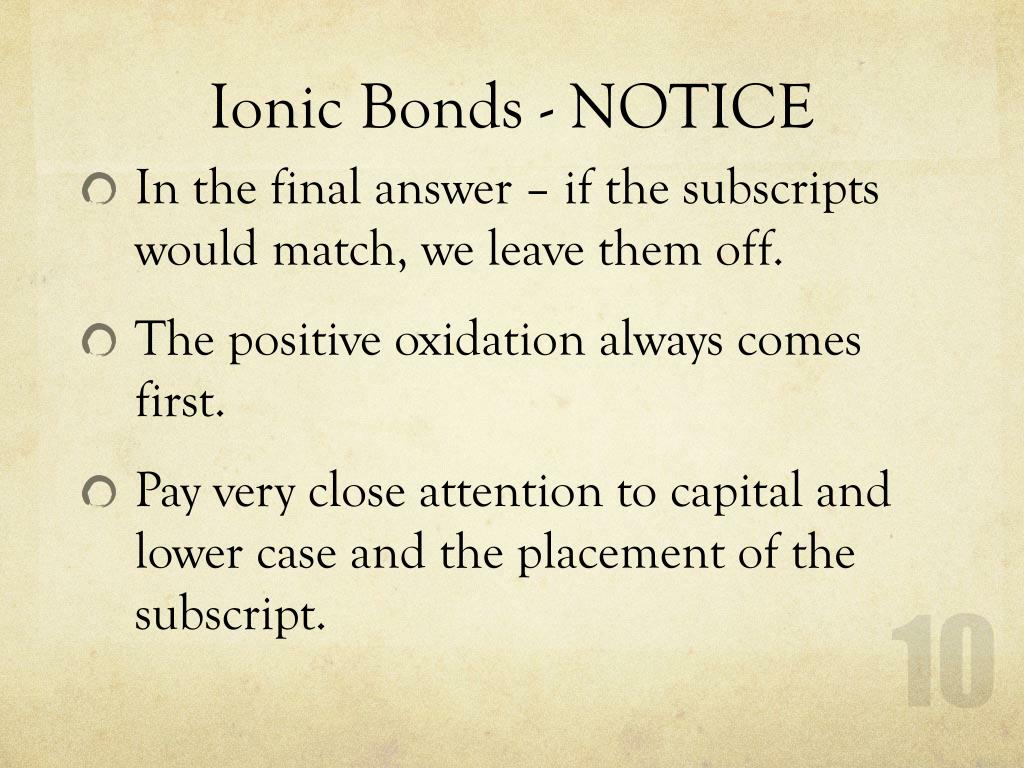 Ionic Bonds - NOTICE • In the final answer – if the subscripts would match, we leave them off. • The positive oxidation always comes first. • Pay very close attention to capital and lower case and the placement of the subscript.