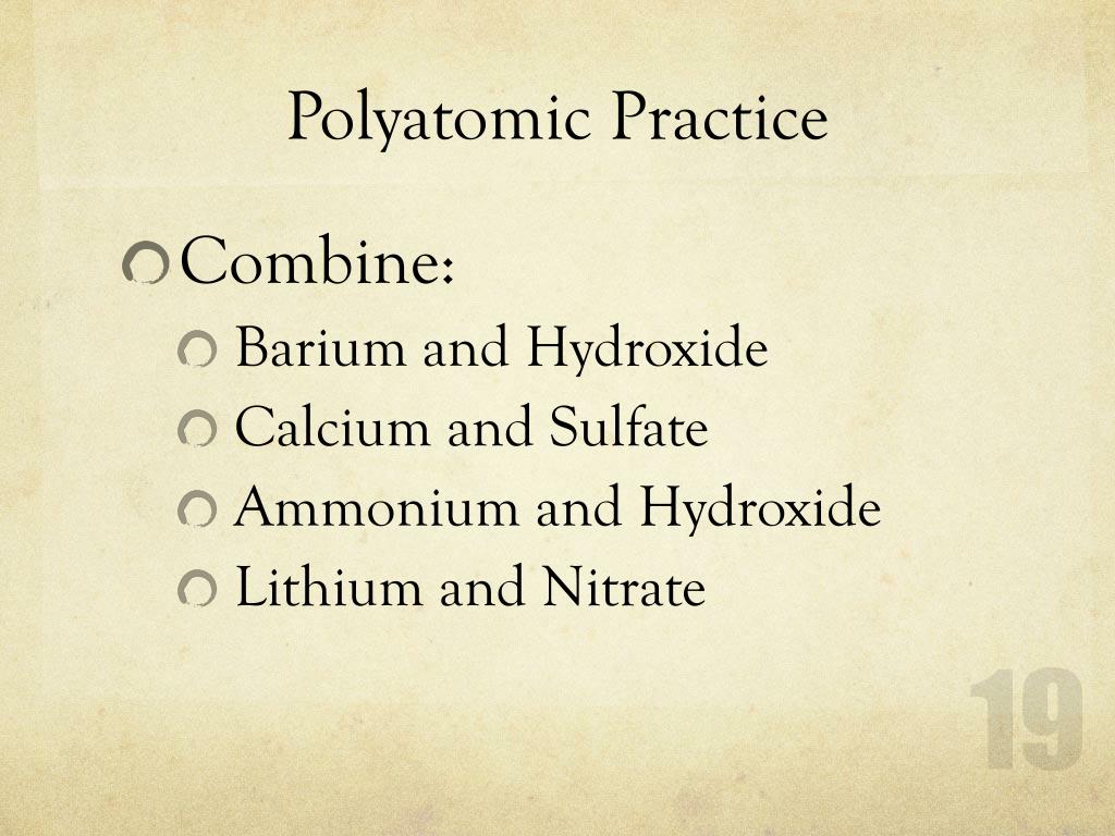 Polyatomic Practice • Combine: • Barium and Hydroxide • Calcium and Sulfate • Ammonium and Hydroxide • Lithium and Nitrate