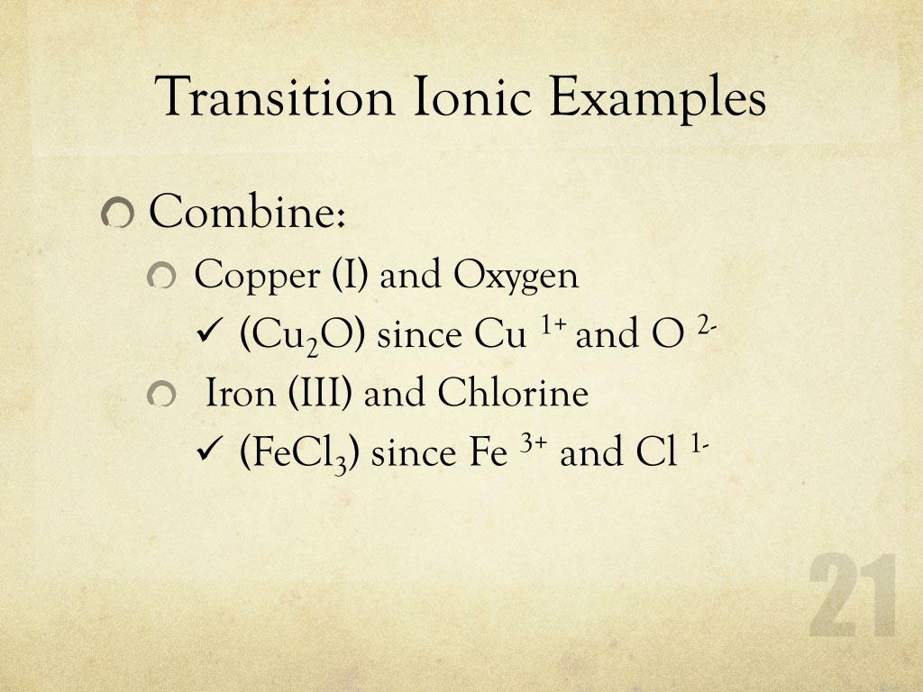 Transition Ionic Examples • Combine: • Copper (I) and Oxygen • (Cu2O) since Cu 1+ and O 2- • Iron (III) and Chlorine • (FeCl3) since Fe 3+ and Cl1-