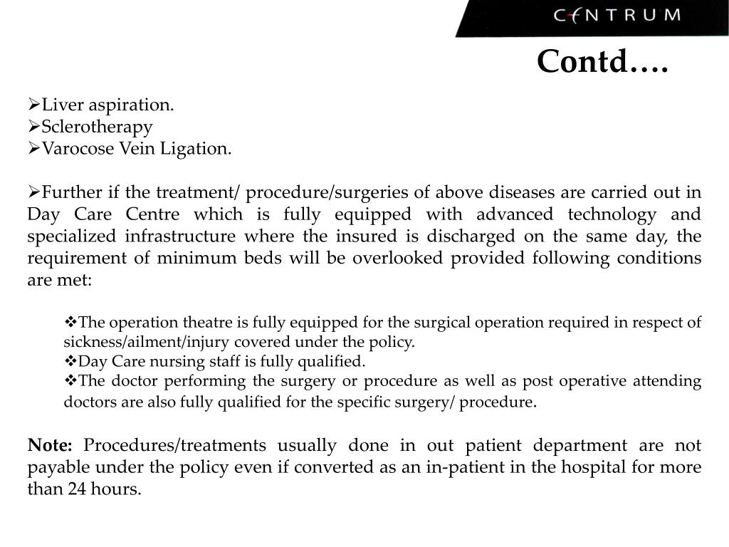 Contd…. • Liver aspiration. • Sclerotherapy • Varocose Vein Ligation. • Further if the treatment/ procedure/surgeries of above diseases are carried out in Day Care Centre which is fully equipped with advanced technology and specialized infrastructure where the insured is discharged on the same day, the requirement of minimum beds will be overlooked provided following conditions are met: • The operation theatre is fully equipped for the surgical operation required in respect of sickness/ailment/injury covered under the policy. • Day Care nursing staff is fully qualified. • The doctor performing the surgery or procedure as well as post operative attending doctors are also fully qualified for the specific surgery/ procedure. • Note: Procedures/treatments usually done in out patient department are not payable under the policy even if converted as an in-patient in the hospital for more than 24 hours.