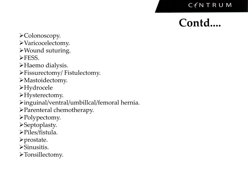 Contd.... • Colonoscopy. • Varicocelectomy. • Wound suturing. • FESS. • Haemo dialysis. • Fissurectomy/ Fistulectomy. • Mastoidectomy. • Hydrocele • Hysterectomy. • inguinal/ventral/umbillcal/femoral hernia. • Parenteral chemotherapy. • Polypectomy. • Septoplasty. • Piles/fistula. • prostate. • Sinusitis. • Tonsillectomy.