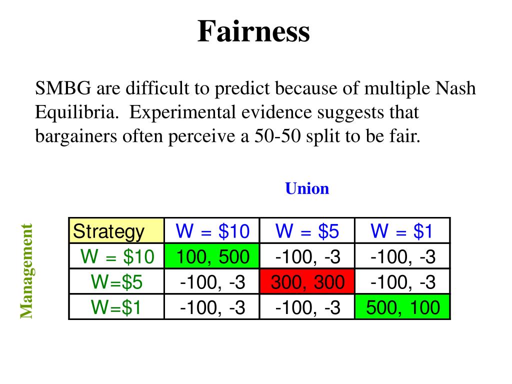 Fairness SMBG are difficult to predict because of multiple Nash Equilibria. Experimental evidence suggests that bargainers often perceive a 50-50 split to be fair. Union Management