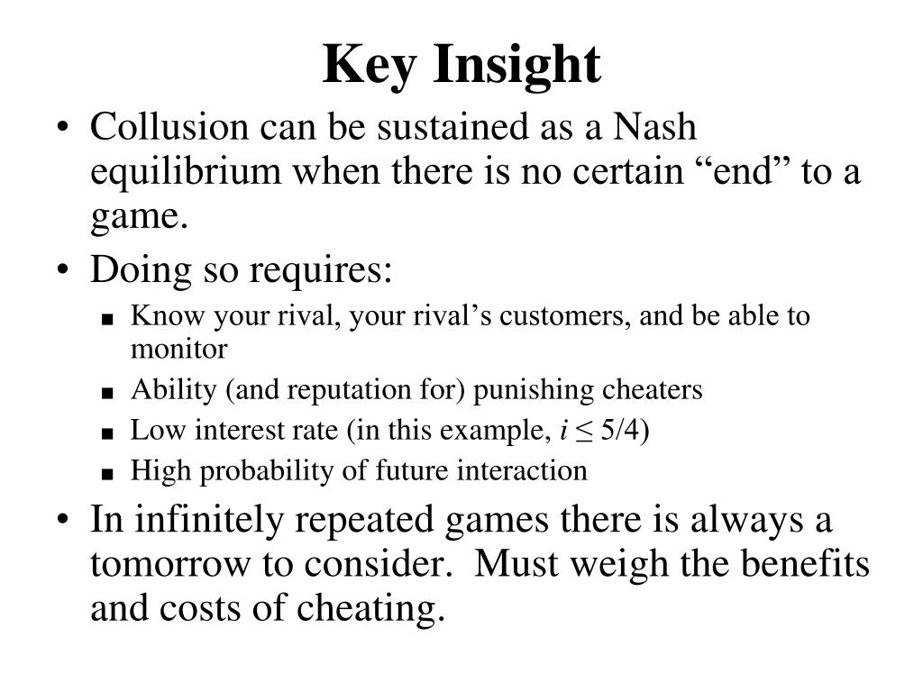 Key Insight • Collusion can be sustained as a Nash equilibrium when there is no certain “end” to a game. • Doing so requires: • Know your rival, your rival’s customers, and be able to monitor • Ability (and reputation for) punishing cheaters • Low interest rate (in this example, i≤ 5/4) • High probability of future interaction • In infinitely repeated games there is always a tomorrow to consider. Must weigh the benefits and costs of cheating.