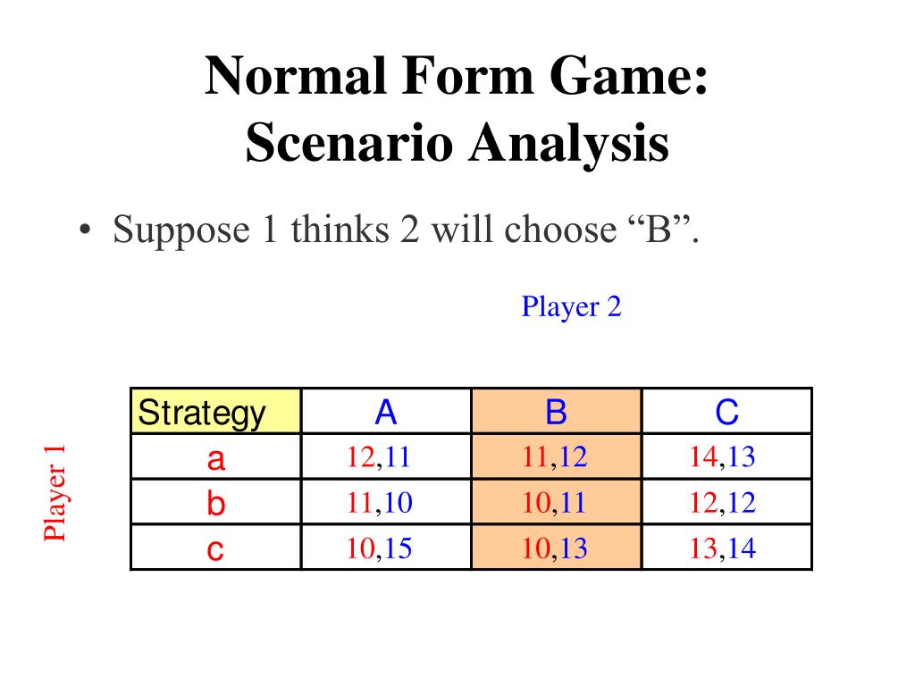 11,10 10,11 12,12 10,15 10,13 13,14 Normal Form Game:Scenario Analysis • Suppose 1 thinks 2 will choose “B”. Player 2 12,11 11,12 14,13 Player 1