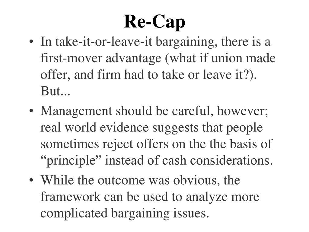 Re-Cap • In take-it-or-leave-it bargaining, there is a first-mover advantage (what if union made offer, and firm had to take or leave it?). But... • Management should be careful, however; real world evidence suggests that people sometimes reject offers on the the basis of “principle” instead of cash considerations. • While the outcome was obvious, the framework can be used to analyze more complicated bargaining issues.