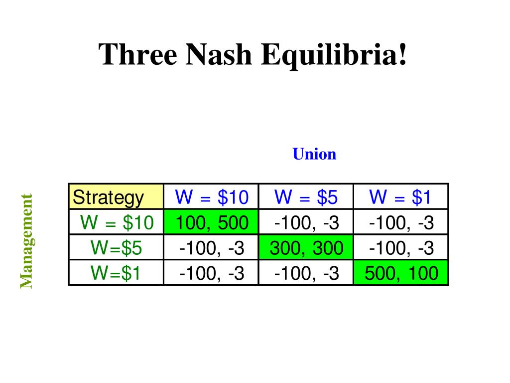 There are 3 Nash Equilibrium Outcomes! Accept 100, 500 Union -100, -3 Reject 10 Accept 300, 300 5 Firm Union -100, -3 Reject 1 Accept 500, 100 Union -100, -3 Reject