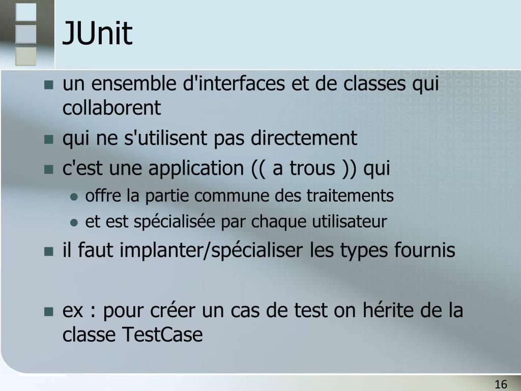 JUnit un ensemble d'interfaces et de classes qui collaborent qui ne s'utilisent pas directement c'est une application (( a trous )) qui offre la partie commune des traitements et est spécialisée par chaque utilisateur il faut implanter/spécialiser les types fournis ex : pour créer un cas de test on hérite de la classe TestCase 16