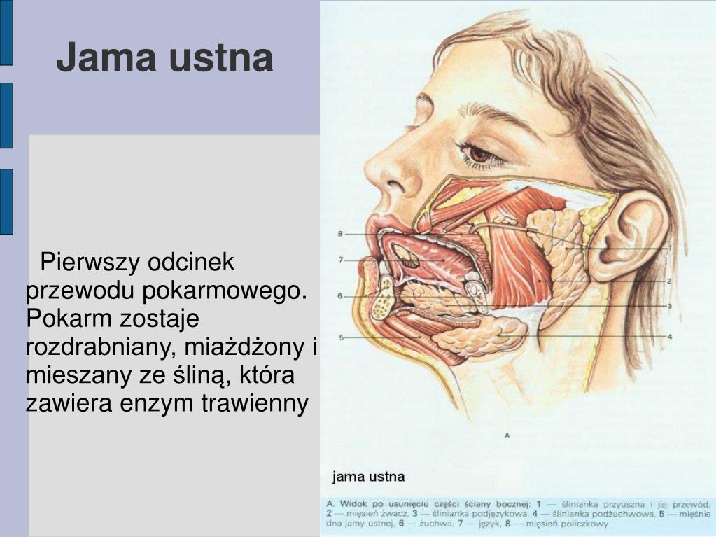 Pierwszy odcinek przewodu pokarmowego. Pokarm zostaje rozdrabniany, miażdżony i mieszany ze śliną, która zawiera enzym trawienny Jama ustna