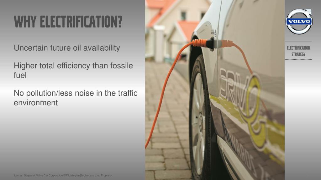 Whyelectrification? • Uncertainfutureoilavailability • Higher total efficiencythanfossilefuel • No pollution/less noise in the trafficenvironment Lennart Stegland, Volvo Car Corporation EPS, lsteglan@volvocars.com, Propriety