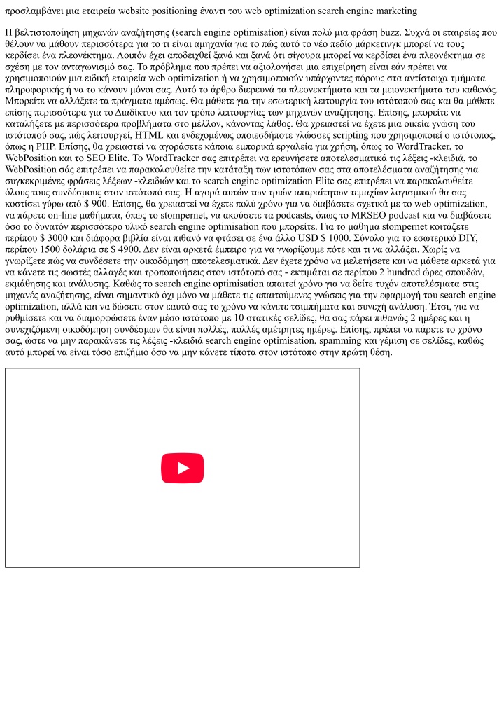 προσλαμβάνει μια εταιρεία website positioning έναντι του web optimization search engine marketing Η βελτιστοποίηση μηχανών αναζήτησης (search engine optimisation) είναι πολύ μια φράση buzz. Συχνά οι εταιρείες που θέλουν να μάθουν περισσότερα για το τι είναι αμηχανία για το πώς αυτό το νέο πεδίο μάρκετινγκ μπορεί να τους κερδίσει ένα πλεονέκτημα. Λοιπόν έχει αποδειχθεί ξανά και ξανά ότι σίγουρα μπορεί να κερδίσει ένα πλεονέκτημα σε σχέση με τον ανταγωνισμό σας. Το πρόβλημα που πρέπει να αξιολογήσει μια επιχείρηση είναι εάν πρέπει να χρησιμοποιούν μια ειδική εταιρεία web optimization ή να χρησιμοποιούν υπάρχοντες πόρους στα αντίστοιχα τμήματα πληροφορικής ή να το κάνουν μόνοι σας. Αυτό το άρθρο διερευνά τα πλεονεκτήματα και τα μειονεκτήματα του καθενός. Μπορείτε να αλλάξετε τα πράγματα αμέσως. Θα μάθετε για την εσωτερική λειτουργία του ιστότοπού σας και θα μάθετε επίσης περισσότερα για το Διαδίκτυο και τον τρόπο λειτουργίας των μηχανών αναζήτησης. Επίσης, μπορείτε να καταλήξετε με περισσότερα προβλήματα στο μέλλον, κάνοντας λάθος. Θα χρειαστεί να έχετε μια οικεία γνώση του ιστότοπού σας, πώς λειτουργεί, HTML και ενδεχομένως οποιεσδήποτε γλώσσες scripting που χρησιμοποιεί ο ιστότοπος, όπως η PHP. Επίσης, θα χρειαστεί να αγοράσετε κάποια εμπορικά εργαλεία για χρήση, όπως το WordTracker, το WebPosition και το SEO Elite. Το WordTracker σας επιτρέπει να ερευνήσετε αποτελεσματικά τις λέξεις -κλειδιά, το WebPosition σάς επιτρέπει να παρακολουθείτε την κατάταξη των ιστοτόπων σας στα αποτελέσματα αναζήτησης για συγκεκριμένες φράσεις λέξεων -κλειδιών και το search engine optimization Elite σας επιτρέπει να παρακολουθείτε όλους τους συνδέσμους στον ιστότοπό σας. Η αγορά αυτών των τριών απαραίτητων τεμαχίων λογισμικού θα σας κοστίσει γύρω από $ 900. Επίσης, θα χρειαστεί να έχετε πολύ χρόνο για να διαβάσετε σχετικά με το web optimization, να πάρετε on-line μαθήματα, όπως το stompernet, να ακούσετε τα podcasts, όπως το MRSEO podcast και να διαβάσετε όσο το δυνατόν περισσότερο υλικό search engine optimisation που μπορείτε. Για το μάθημα stompernet κοιτάζετε περίπου $ 3000 και διάφορα βιβλία είναι πιθανό να φτάσει σε ένα άλλο USD $ 1000. Σύνολο για το εσωτερικό DIY, περίπου 1500 δολάρια σε $ 4900. Δεν είναι αρκετά έμπειρο για να γνωρίζουμε πότε και τι να αλλάξει. Χωρίς να γνωρίζετε πώς να συνδέσετε την οικοδόμηση αποτελεσματικά. Δεν έχετε χρόνο να μελετήσετε και να μάθετε αρκετά για να κάνετε τις σωστές αλλαγές και τροποποιήσεις στον ιστότοπό σας - εκτιμάται σε περίπου 2 hundred ώρες σπουδών, εκμάθησης και ανάλυσης. Καθώς το search engine optimisation απαιτεί χρόνο για να δείτε τυχόν αποτελέσματα στις μηχανές αναζήτησης, είναι σημαντικό όχι μόνο να μάθετε τις απαιτούμενες γνώσεις για την εφαρμογή του search engine optimization, αλλά και να δώσετε στον εαυτό σας το χρόνο να κάνετε τσιμπήματα και συνεχή ανάλυση. Έτσι, για να ρυθμίσετε και να διαμορφώσετε έναν μέσο ιστότοπο με 10 στατικές σελίδες, θα σας πάρει πιθανώς 2 ημέρες και η συνεχιζόμενη οικοδόμηση συνδέσμων θα είναι πολλές, πολλές αμέτρητες ημέρες. Επίσης, πρέπει να πάρετε το χρόνο σας, ώστε να μην παρακάνετε τις λέξεις -κλειδιά search engine optimisation, spamming και γέμιση σε σελίδες, καθώς αυτό μπορεί να είναι τόσο επιζήμιο όσο να μην κάνετε τίποτα στον ιστότοπο στην πρώτη θέση.