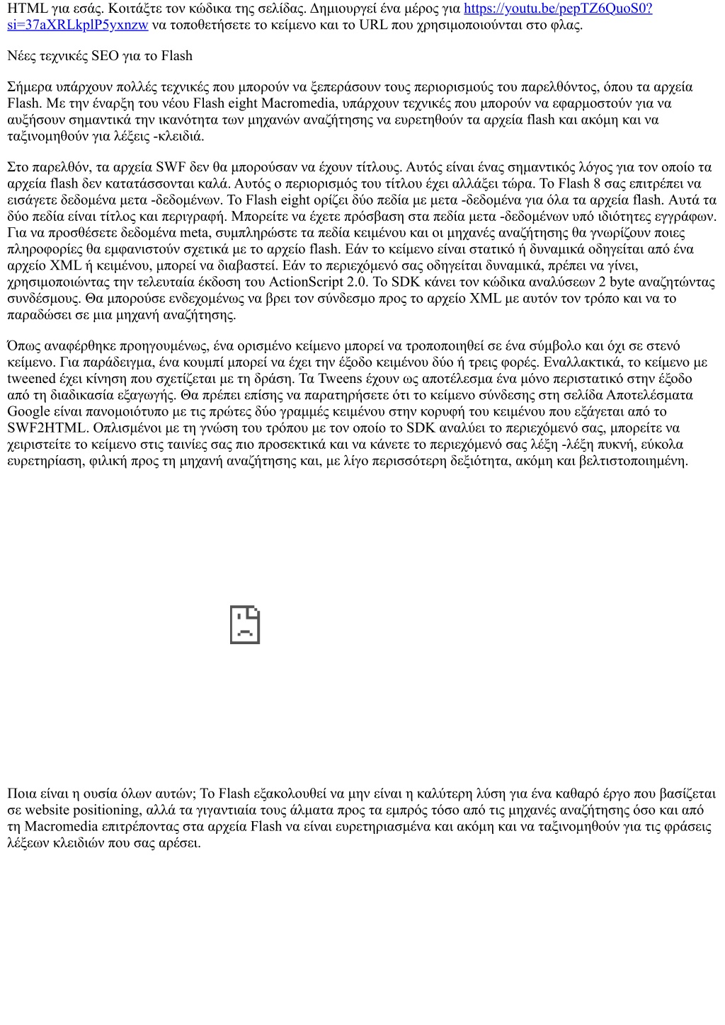 HTML για εσάς. Κοιτάξτε τον κώδικα της σελίδας. Δημιουργεί ένα μέρος για https://youtu.be/pepTZ6QuoS0? si=37aXRLkplP5yxnzw να τοποθετήσετε το κείμενο και το URL που χρησιμοποιούνται στο φλας. Νέες τεχνικές SEO για το Flash Σήμερα υπάρχουν πολλές τεχνικές που μπορούν να ξεπεράσουν τους περιορισμούς του παρελθόντος, όπου τα αρχεία Flash. Με την έναρξη του νέου Flash eight Macromedia, υπάρχουν τεχνικές που μπορούν να εφαρμοστούν για να αυξήσουν σημαντικά την ικανότητα των μηχανών αναζήτησης να ευρετηθούν τα αρχεία flash και ακόμη και να ταξινομηθούν για λέξεις -κλειδιά. Στο παρελθόν, τα αρχεία SWF δεν θα μπορούσαν να έχουν τίτλους. Αυτός είναι ένας σημαντικός λόγος για τον οποίο τα αρχεία flash δεν κατατάσσονται καλά. Αυτός ο περιορισμός του τίτλου έχει αλλάξει τώρα. Το Flash 8 σας επιτρέπει να εισάγετε δεδομένα μετα -δεδομένων. Το Flash eight ορίζει δύο πεδία με μετα -δεδομένα για όλα τα αρχεία flash. Αυτά τα δύο πεδία είναι τίτλος και περιγραφή. Μπορείτε να έχετε πρόσβαση στα πεδία μετα -δεδομένων υπό ιδιότητες εγγράφων. Για να προσθέσετε δεδομένα meta, συμπληρώστε τα πεδία κειμένου και οι μηχανές αναζήτησης θα γνωρίζουν ποιες πληροφορίες θα εμφανιστούν σχετικά με το αρχείο flash. Εάν το κείμενο είναι στατικό ή δυναμικά οδηγείται από ένα αρχείο XML ή κειμένου, μπορεί να διαβαστεί. Εάν το περιεχόμενό σας οδηγείται δυναμικά, πρέπει να γίνει, χρησιμοποιώντας την τελευταία έκδοση του ActionScript 2.0. Το SDK κάνει τον κώδικα αναλύσεων 2 byte αναζητώντας συνδέσμους. Θα μπορούσε ενδεχομένως να βρει τον σύνδεσμο προς το αρχείο XML με αυτόν τον τρόπο και να το παραδώσει σε μια μηχανή αναζήτησης. Όπως αναφέρθηκε προηγουμένως, ένα ορισμένο κείμενο μπορεί να τροποποιηθεί σε ένα σύμβολο και όχι σε στενό κείμενο. Για παράδειγμα, ένα κουμπί μπορεί να έχει την έξοδο κειμένου δύο ή τρεις φορές. Εναλλακτικά, το κείμενο με tweened έχει κίνηση που σχετίζεται με τη δράση. Τα Tweens έχουν ως αποτέλεσμα ένα μόνο περιστατικό στην έξοδο από τη διαδικασία εξαγωγής. Θα πρέπει επίσης να παρατηρήσετε ότι το κείμενο σύνδεσης στη σελίδα Αποτελέσματα Google είναι πανομοιότυπο με τις πρώτες δύο γραμμές κειμένου στην κορυφή του κειμένου που εξάγεται από το SWF2HTML. Οπλισμένοι με τη γνώση του τρόπου με τον οποίο το SDK αναλύει το περιεχόμενό σας, μπορείτε να χειριστείτε το κείμενο στις ταινίες σας πιο προσεκτικά και να κάνετε το περιεχόμενό σας λέξη -λέξη πυκνή, εύκολα ευρετηρίαση, φιλική προς τη μηχανή αναζήτησης και, με λίγο περισσότερη δεξιότητα, ακόμη και βελτιστοποιημένη. Ποια είναι η ουσία όλων αυτών; Το Flash εξακολουθεί να μην είναι η καλύτερη λύση για ένα καθαρό έργο που βασίζεται σε website positioning, αλλά τα γιγαντιαία τους άλματα προς τα εμπρός τόσο από τις μηχανές αναζήτησης όσο και από τη Macromedia επιτρέποντας στα αρχεία Flash να είναι ευρετηριασμένα και ακόμη και να ταξινομηθούν για τις φράσεις λέξεων κλειδιών που σας αρέσει.