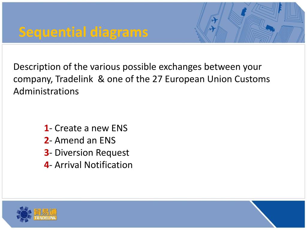 Sequential diagrams Description of the various possible exchanges between your company, Tradelink &one of the 27 European Union Customs Administrations 1- Create a new ENS 2- Amend an ENS 3- Diversion Request 4- Arrival Notification