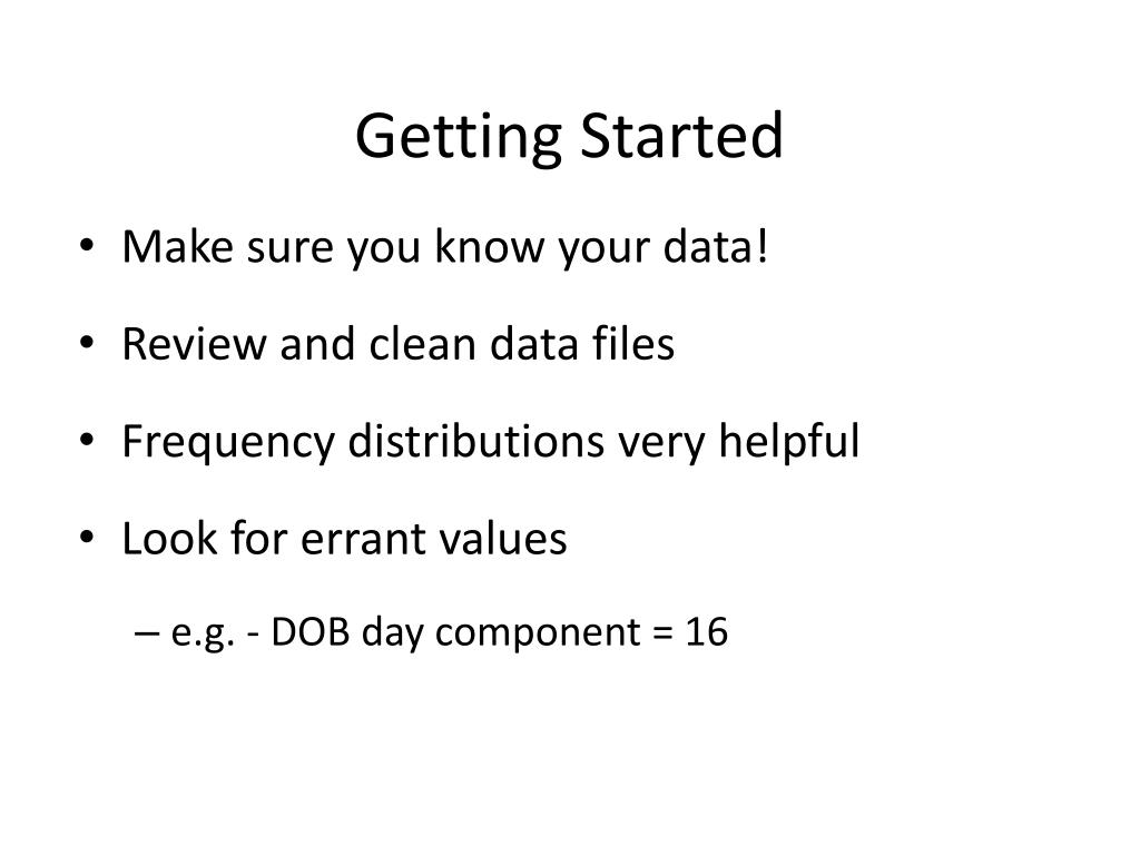 Getting Started • Make sure you know your data! • Review and clean data files • Frequency distributions very helpful • Look for errant values • e.g. - DOB day component = 16