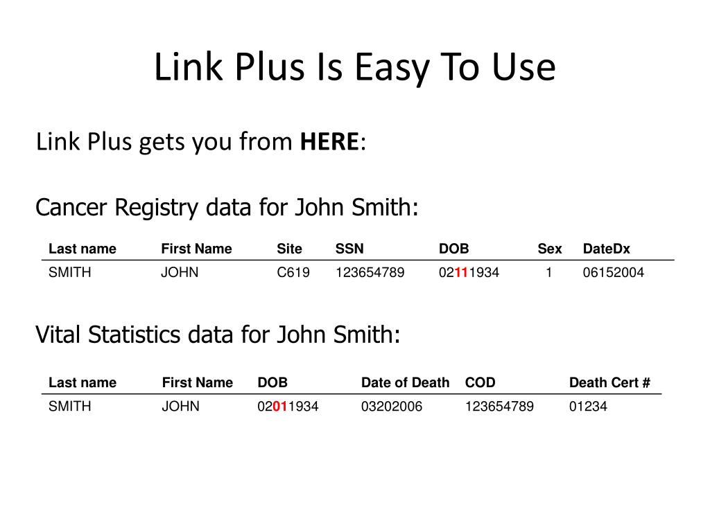 Link Plus Is Easy To Use Link Plus gets you from HERE: Cancer Registry data for John Smith: Vital Statistics data for John Smith: