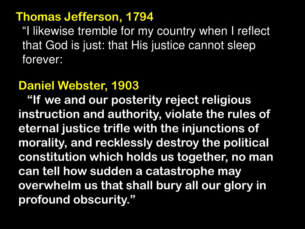 Thomas Jefferson, 1794 “I likewise tremble for my country when I reflect that God is just: that His justice cannot sleep forever: Daniel Webster, 1903 “If we and our posterity reject religious instruction and authority, violate the rules of eternal justice trifle with the injunctions of morality, and recklessly destroy the political constitution which holds us together, no man can tell how sudden a catastrophe may overwhelm us that shall bury all our glory in profound obscurity.”