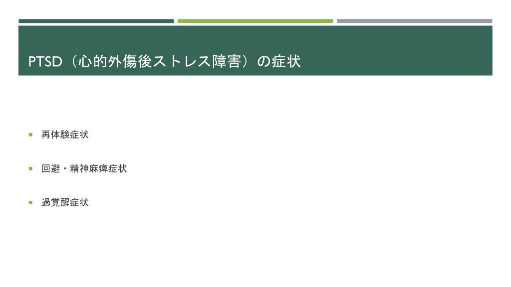 PTSD(心的外傷後ストレス障害)の症状 • 再体験症状 • 回避・精神麻痺症状 • 過覚醒症状