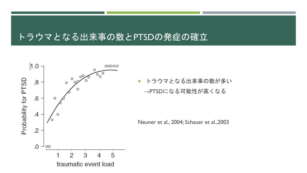トラウマとなる出来事の数とPTSDの発症の確立トラウマとなる出来事の数とPTSDの発症の確立 • トラウマとなる出来事の数が多い →PTSDになる可能性が高くなる Neuner et al., 2004; Schauer et al.,2003