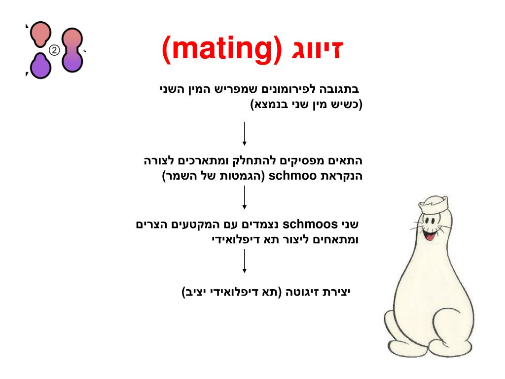 זיווג ((mating בתגובה לפירומונים שמפריש המין השני (כשיש מין שני בנמצא) התאים מפסיקים להתחלק ומתארכים לצורה הנקראת schmoo (הגמטות של השמר) שני schmoos נצמדים עם המקטעים הצרים ומתאחים ליצור תא דיפלואידי יצירת זיגוטה (תא דיפלואידי יציב)
