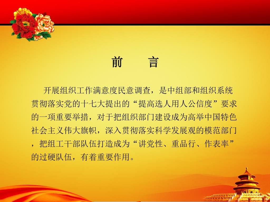 前 言 开展组织工作满意度民意调查,是中组部和组织系统贯彻落实党的十七大提出的“提高选人用人公信度”要求的一项重要举措,对于把组织部门建设成为高举中国特色社会主义伟大旗帜,深入贯彻落实科学发展观的模范部门,把组工干部队伍打造成为“讲党性、重品行、作表率”的过硬队伍,有着重要作用。