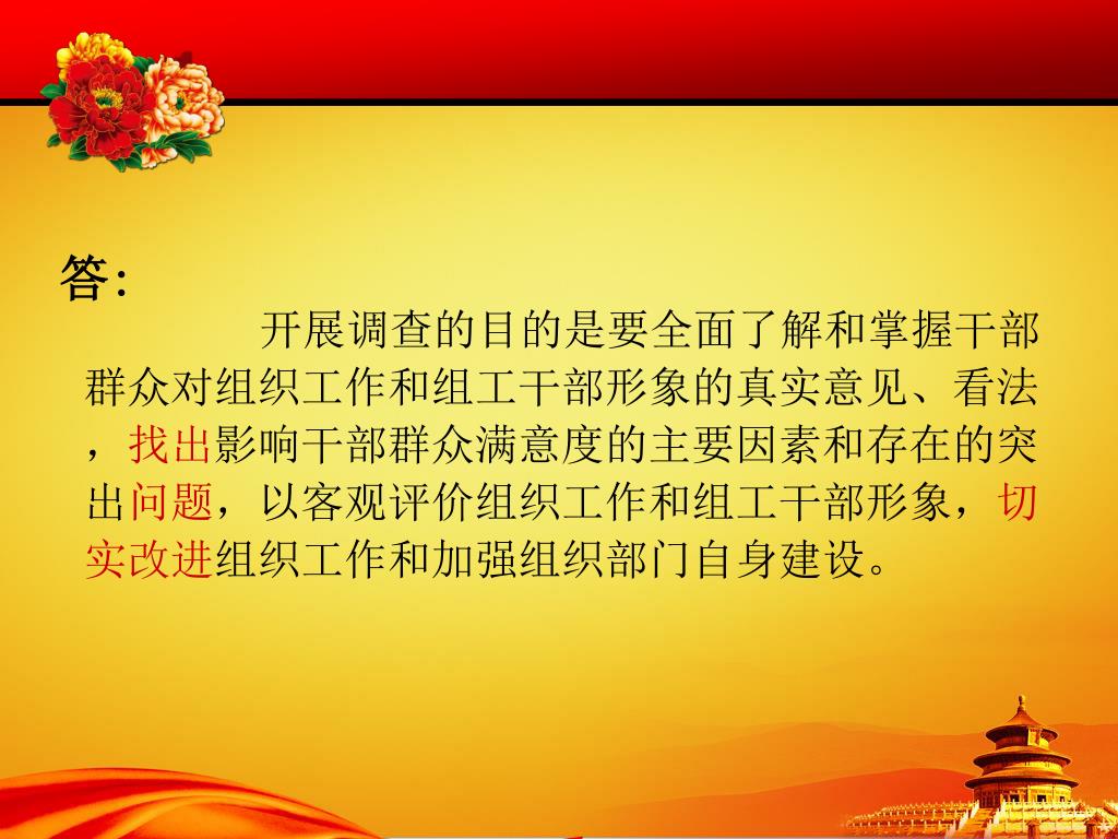 答: 开展调查的目的是要全面了解和掌握干部群众对组织工作和组工干部形象的真实意见、看法,找出影响干部群众满意度的主要因素和存在的突出问题,以客观评价组织工作和组工干部形象,切实改进组织工作和加强组织部门自身建设。