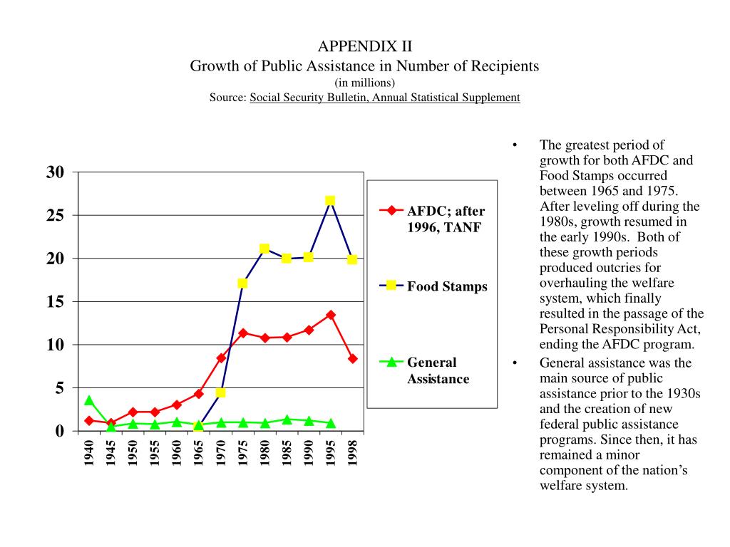 APPENDIX IIGrowth of Public Assistance in Number of Recipients(in millions)Source: Social Security Bulletin, Annual Statistical Supplement • The greatest period of growth for both AFDC and Food Stamps occurred between 1965 and 1975. After leveling off during the 1980s, growth resumed in the early 1990s. Both of these growth periods produced outcries for overhauling the welfare system, which finally resulted in the passage of the Personal Responsibility Act, ending the AFDC program. • General assistance was the main source of public assistance prior to the 1930s and the creation of new federal public assistance programs. Since then, it has remained a minor component of the nation’s welfare system.