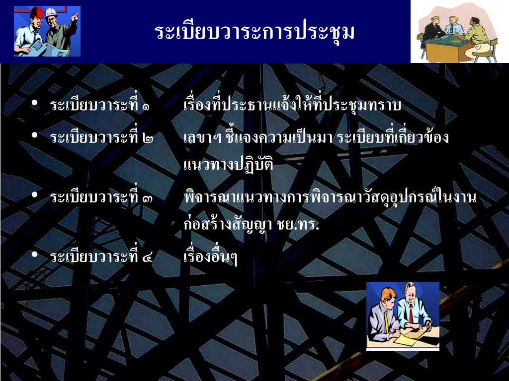 ระเบียบวาระการประชุม • ระเบียบวาระที่ ๑ เรื่องที่ประธานแจ้งให้ที่ประชุมทราบ • ระเบียบวาระที่ ๒ เลขาฯ ชี้แจงความเป็นมา ระเบียบที่เกี่ยวข้อง แนวทางปฏิบัติ • ระเบียบวาระที่ ๓ พิจารณาแนวทางการพิจารณาวัสดุอุปกรณ์ในงาน ก่อสร้างสัญญา ชย.ทร. • ระเบียบวาระที่ ๔ เรื่องอื่นๆ