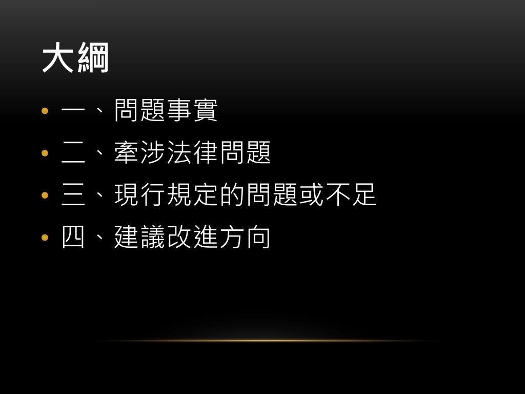 大綱 • 一、問題事實 • 二、牽涉法律問題 • 三、現行規定的問題或不足 • 四、建議改進方向
