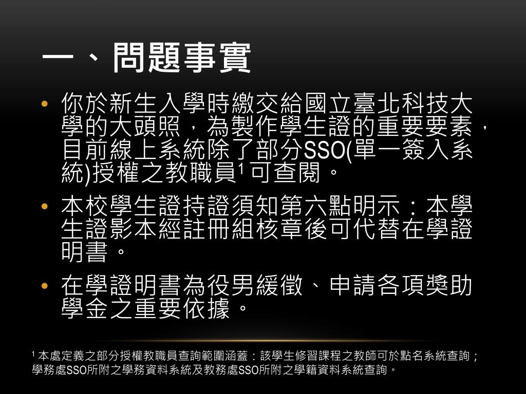 一、問題事實 • 你於新生入學時繳交給國立臺北科技大學的大頭照,為製作學生證的重要要素,目前線上系統除了部分SSO(單一簽入系統)授權之教職員1 可查閱。 • 本校學生證持證須知第六點明示:本學生證影本經註冊組核章後可代替在學證明書。 • 在學證明書為役男緩徵、申請各項獎助學金之重要依據。 1 本處定義之部分授權教職員查詢範圍涵蓋:該學生修習課程之教師可於點名系統查詢;學務處SSO所附之學務資料系統及教務處SSO所附之學籍資料系統查詢。