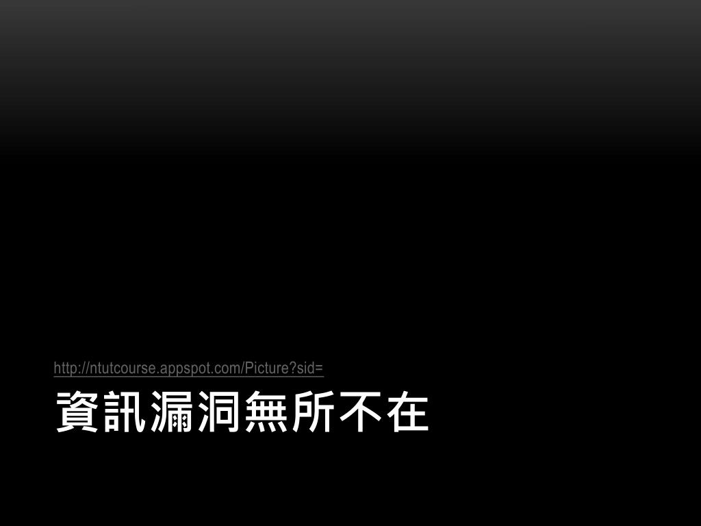 刑法 第36章 妨害電腦使用罪 • §358……破解使用電腦之保護措施或利用電腦系統之漏洞,而入侵他人之電腦…… • §359無故取得、刪除或變更他人電腦或其相關設備之電磁紀錄,致生損害於公眾…… • §361對於公務機關之電腦或其相關設備犯前三條之罪者,加重其刑至二分之一