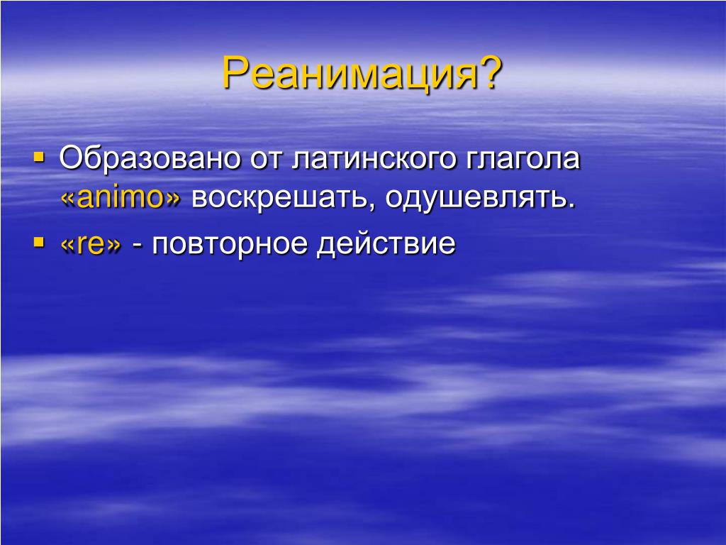 Реанимация? Образовано от латинского глагола «animo»воскрешать, одушевлять. «re» - повторное действие