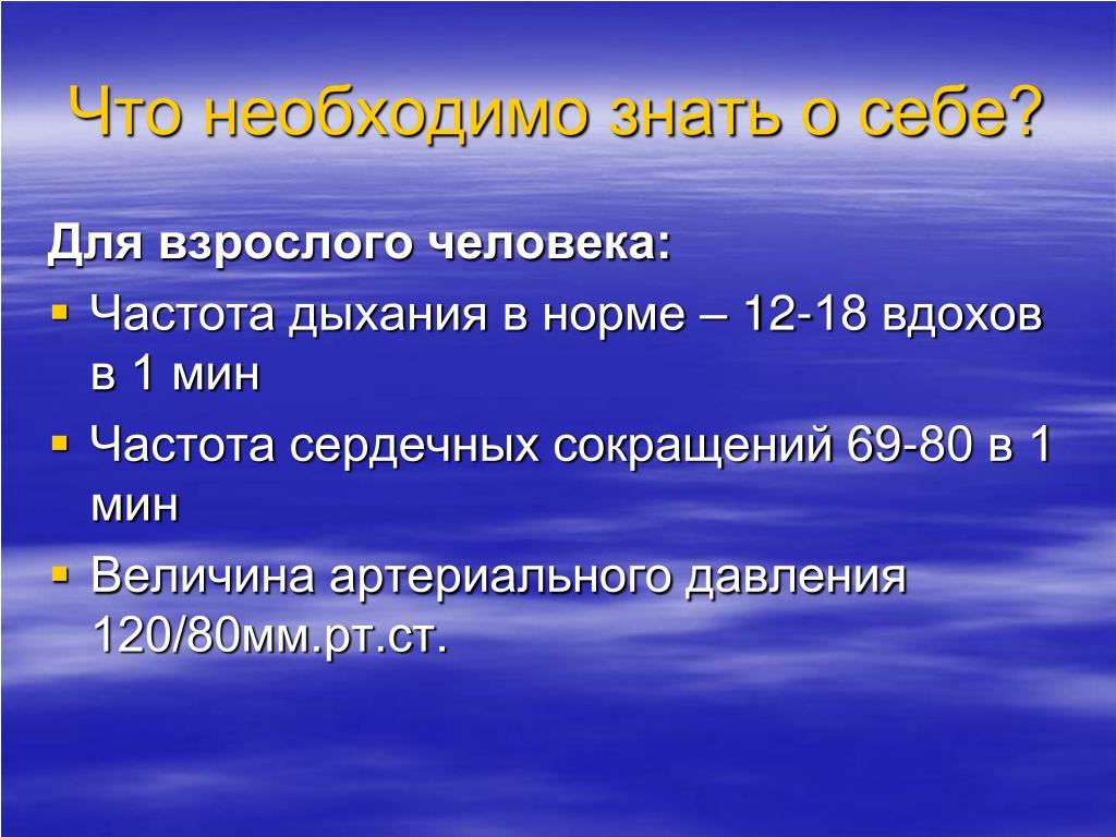 Что необходимо знать о себе? Для взрослого человека: Частота дыхания в норме – 12-18 вдохов в 1 мин Частота сердечных сокращений 69-80 в 1 мин Величина артериального давления 120/80мм.рт.ст.