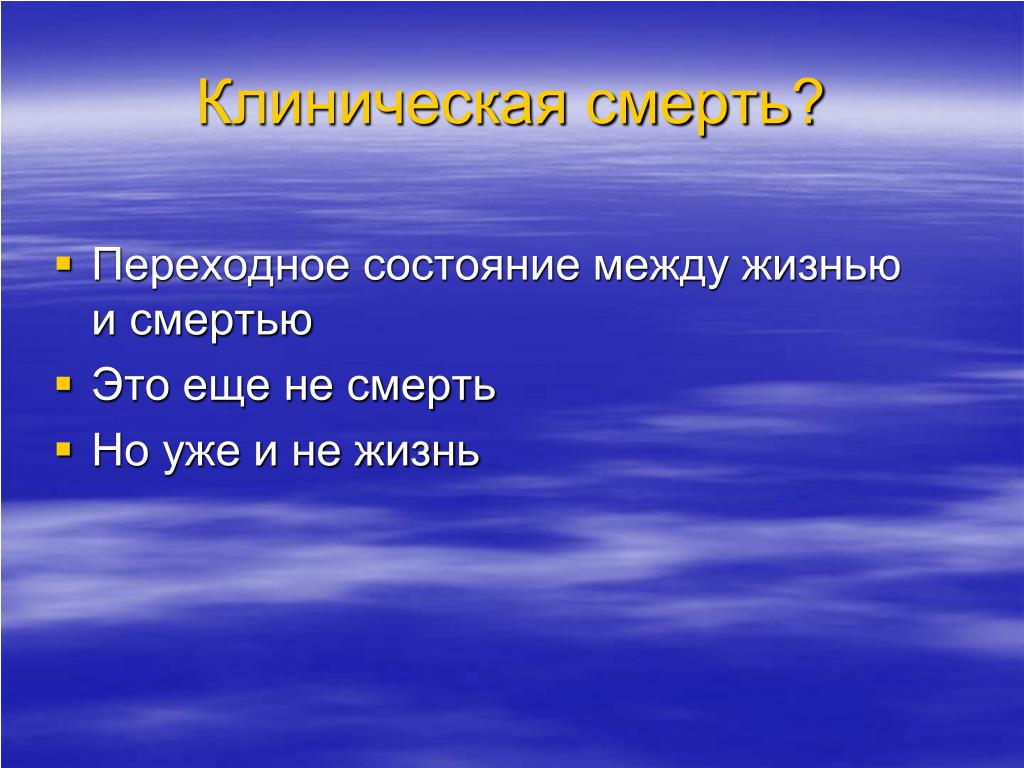 Клиническая смерть? Переходное состояние между жизнью и смертью Это еще не смерть Но уже и не жизнь