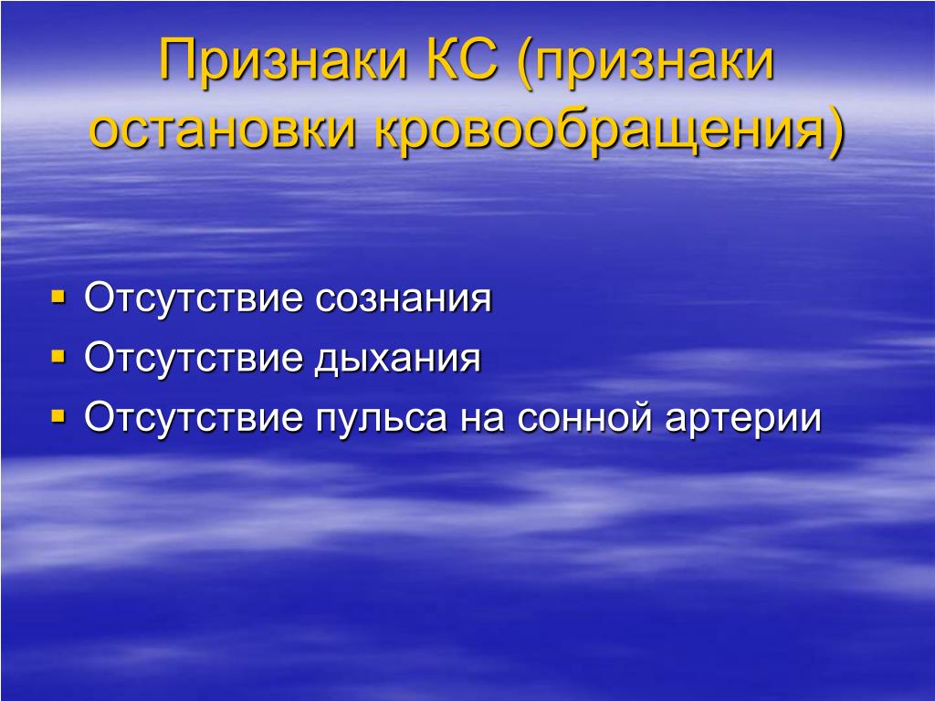 Признаки КС (признаки остановки кровообращения) Отсутствие сознания Отсутствие дыхания Отсутствие пульса на сонной артерии