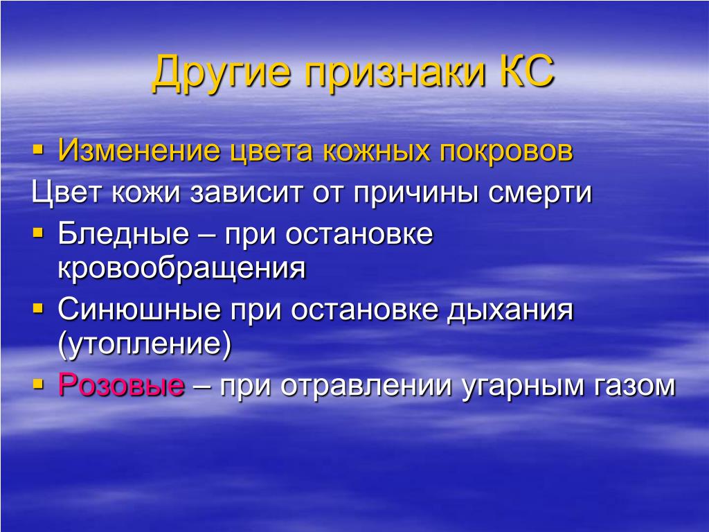 Другие признаки КС Изменение цвета кожных покровов Цвет кожи зависит от причины смерти Бледные – при остановке кровообращения Синюшныепри остановке дыхания (утопление) Розовые– при отравлении угарным газом