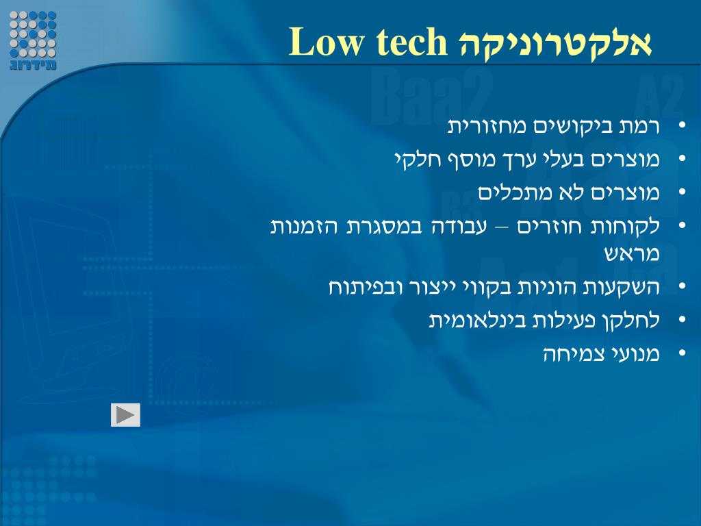 אלקטרוניקה Low tech • רמת ביקושים מחזורית • מוצרים בעלי ערך מוסף חלקי • מוצרים לא מתכלים • לקוחות חוזרים – עבודה במסגרת הזמנות מראש • השקעות הוניות בקווי ייצור ובפיתוח • לחלקן פעילות בינלאומית • מנועי צמיחה