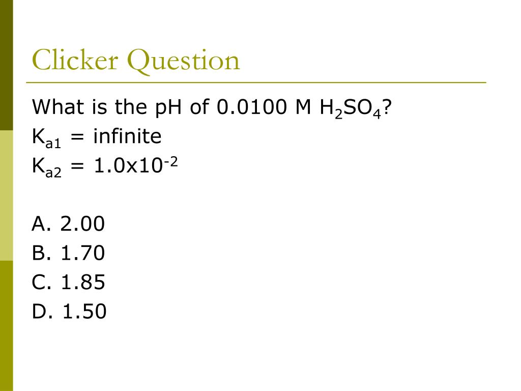 Clicker Question What is the pH of 0.0100 M H2SO4? Ka1 = infinite Ka2 = 1.0x10-2 A. 2.00 B. 1.70 C. 1.85 D. 1.50