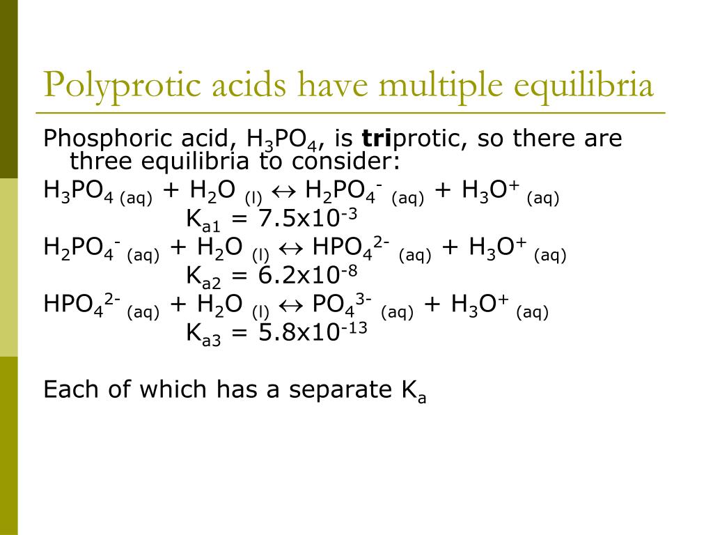 Polyprotic acids have multiple equilibria Phosphoric acid, H3PO4, is triprotic, so there are three equilibria to consider: H3PO4 (aq) + H2O (l) H2PO4-(aq) + H3O+ (aq) H2PO4- (aq) + H2O (l) HPO42-(aq) + H3O+ (aq) HPO42- (aq) + H2O (l) PO43-(aq) + H3O+ (aq) Each of which has a separate Ka