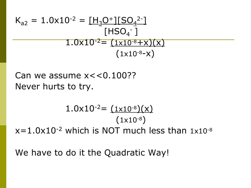 Ka2 = 1.0x10-2 = [H3O+][SO42-] [HSO4-] 1.0x10-2= (1x10-8+x)(x) (1x10-8-x) Can we assume x<<0.100?? Never hurts to try. 1.0x10-2= (1x10-8)(x) (1x10-8) x=1.0x10-2 which is NOT much less than 1x10-8 We have to do it the Quadratic Way!