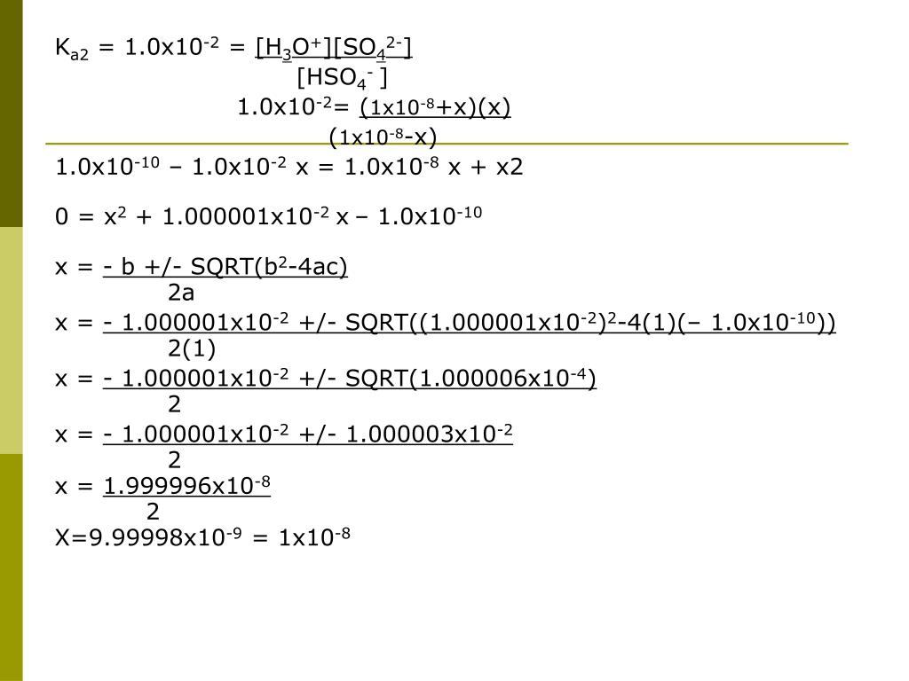 Ka2 = 1.0x10-2 = [H3O+][SO42-] [HSO4-] 1.0x10-2= (1x10-8+x)(x) (1x10-8-x) 1.0x10-10 – 1.0x10-2 x = 1.0x10-8 x + x2 0 = x2 + 1.000001x10-2 x– 1.0x10-10 x = - b +/- SQRT(b2-4ac) 2a x = - 1.000001x10-2 +/- SQRT((1.000001x10-2)2-4(1)(– 1.0x10-10)) 2(1) x = - 1.000001x10-2 +/- SQRT(1.000006x10-4) 2 x = - 1.000001x10-2 +/- 1.000003x10-2 2 x = 1.999996x10-8 2 X=9.99998x10-9 = 1x10-8