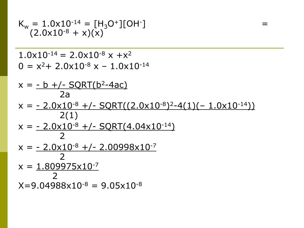 Kw = 1.0x10-14 = [H3O+][OH-] = (2.0x10-8 + x)(x) 1.0x10-14 = 2.0x10-8 x +x2 0 = x2+ 2.0x10-8 x – 1.0x10-14 x = - b +/- SQRT(b2-4ac) 2a x = - 2.0x10-8 +/- SQRT((2.0x10-8)2-4(1)(– 1.0x10-14)) 2(1) x = - 2.0x10-8 +/- SQRT(4.04x10-14) 2 x = - 2.0x10-8 +/- 2.00998x10-7 2 x = 1.809975x10-7 2 X=9.04988x10-8 = 9.05x10-8